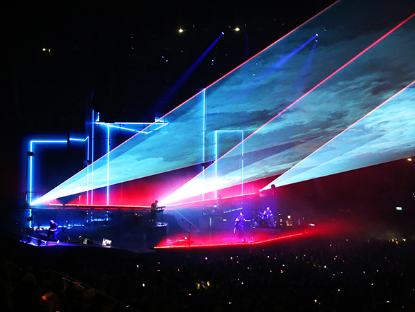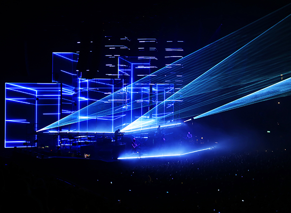 The multi-screen set-up is being run by four Ai R8 media servers. Two R8 servers process content created in real-time effects generator, Notch, which is then fed into the second pair of Ai servers which handle the main content. All of this is then outputted to the massive, angular on-stage LED screens.