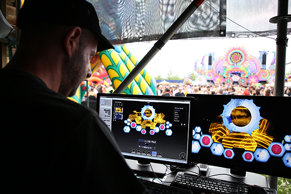On the night, the show was performed on the fly, with Mayer at front of house, on comms with Fatboy Slim's onstage video team, mixing and layering their live feed over the pre-rendered video clips playing from Ai.