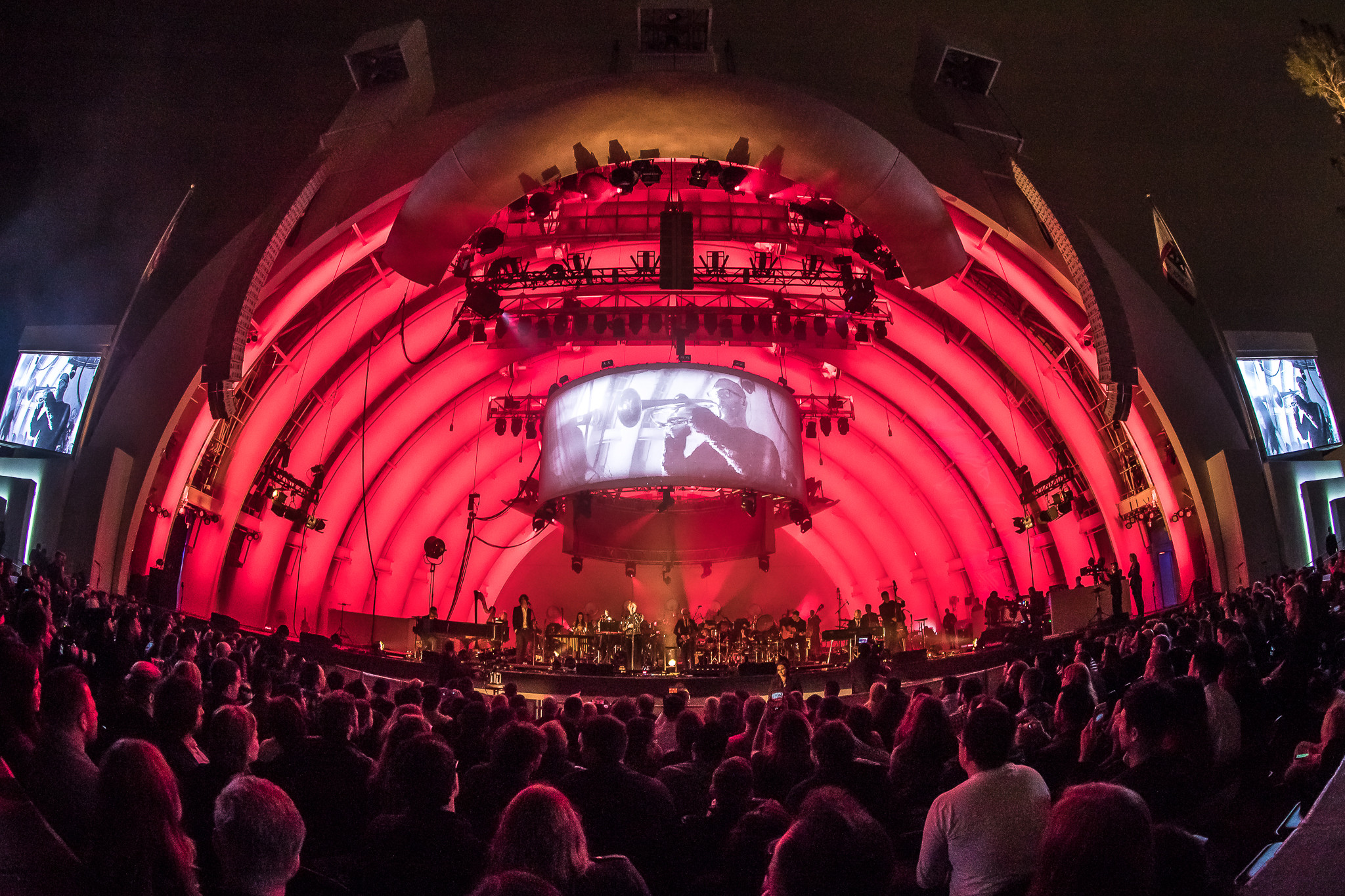 "The video itself was not intended to be traditional IMAG style display, but more of an older, rough, film effect look," says Kyle. "Depending on the venue the rig would change between the three semi circles or a single large screen that wrapped around the drape. For the Hollywood Bowl we also sent an unmapped signal to the in-house IMAG screens to ensure the full crowd of 18,000 could see the show. Another feed also went to the recording crew meaning we pushed the server to six outputs and six inputs."